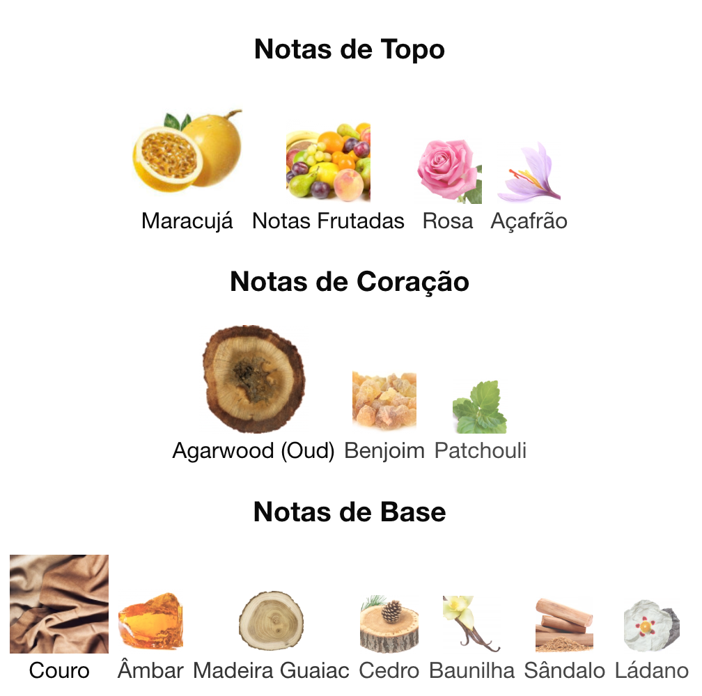 Na base, a fragrância se assenta em uma mistura rica e sensual de couro, madeira de carvalho, âmbar, lábdano e baunilha. As notas quentes e cremosas de baunilha proporcionam um acabamento suave e acolhedor, enquanto o couro e o âmbar trazem sofisticação e uma impressão duradoura.