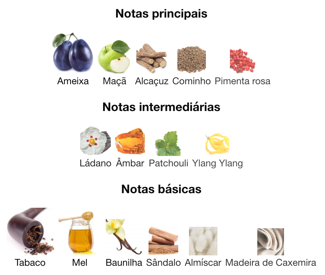 Conforme a fragrância evolui, as notas de coração de âmbar, ylang-ylang e patchouli adicionam profundidade e um toque exótico. As notas de fundo de almíscar, cashmere, mel, baunilha, sândalo e tabaco criam uma base de luxo e riqueza, conferindo um caráter robusto do início ao fim.