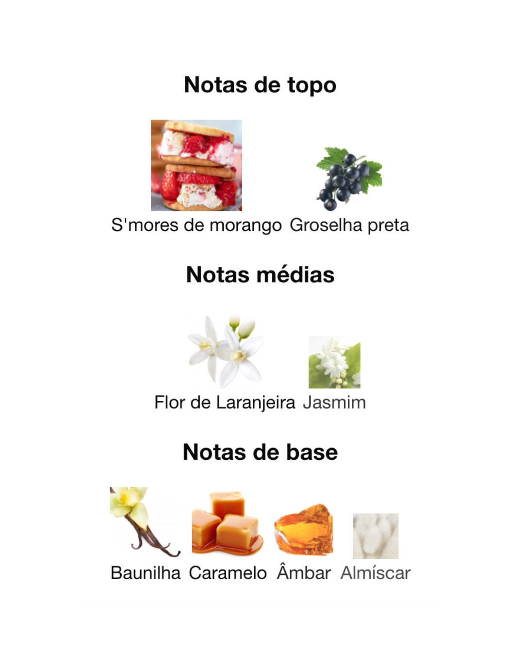 Ao abrir, uma explosão de morangos derretidos e s'mores revela uma doçura irresistível. O coração florido de jasmim e flor de laranjeira traz delicadeza e frescor, enquanto uma base rica em baunilha, caramelo e âmbar almiscarado proporciona um rastro sedutor.